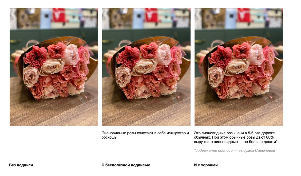 Если на фотографии изображены цветы, не надо подписывать под ней «Красивый букет из роз».